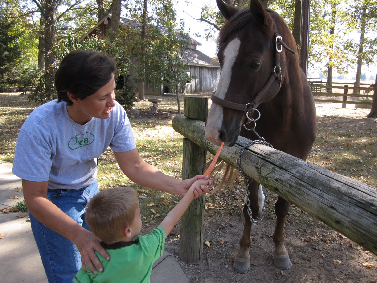 My little farmer turned cowboy on us a week ago. A while back Aiden took an interest in horses. He has a few plastic horses he plays with quite often. So one day I told him that his Aunt Becky has a horse and well that started the weekly asking..."Mommy, can we ride Aunt Becky's horse this week." Every week up until last week was "No, not this week but we'll ask Aunt Becky and go soon." Well last week we finally took Aiden for a ride on Aunt Becky's horse. First things first though he wanted to feed the horses a carrot. I'm not really sure where he got that idea from but no harm done...sounded like a good idea to me. He tried hard but only 1 of the horses was interested in his carrots.